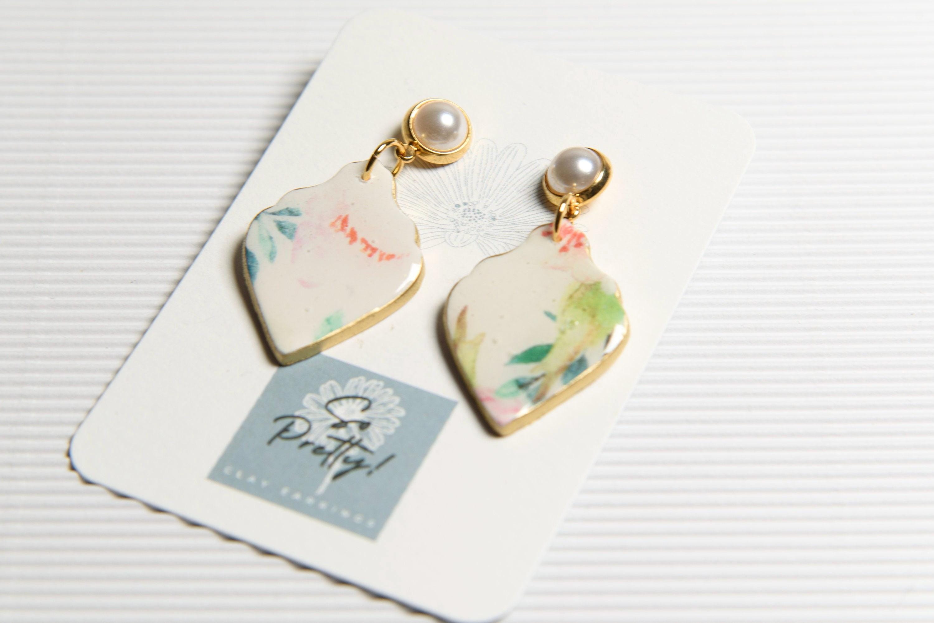 Handmade Floral Watercolor Polymer Clay Earrings: Faux Pearl Studs