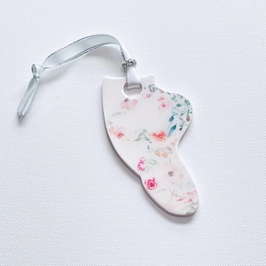 Each ornament has a cutout with a beautiful 5 inch long hanging ribbon with knotted loops that hang 4 inches. Ribbon has a rhinestone bead accent in various colors as shown.