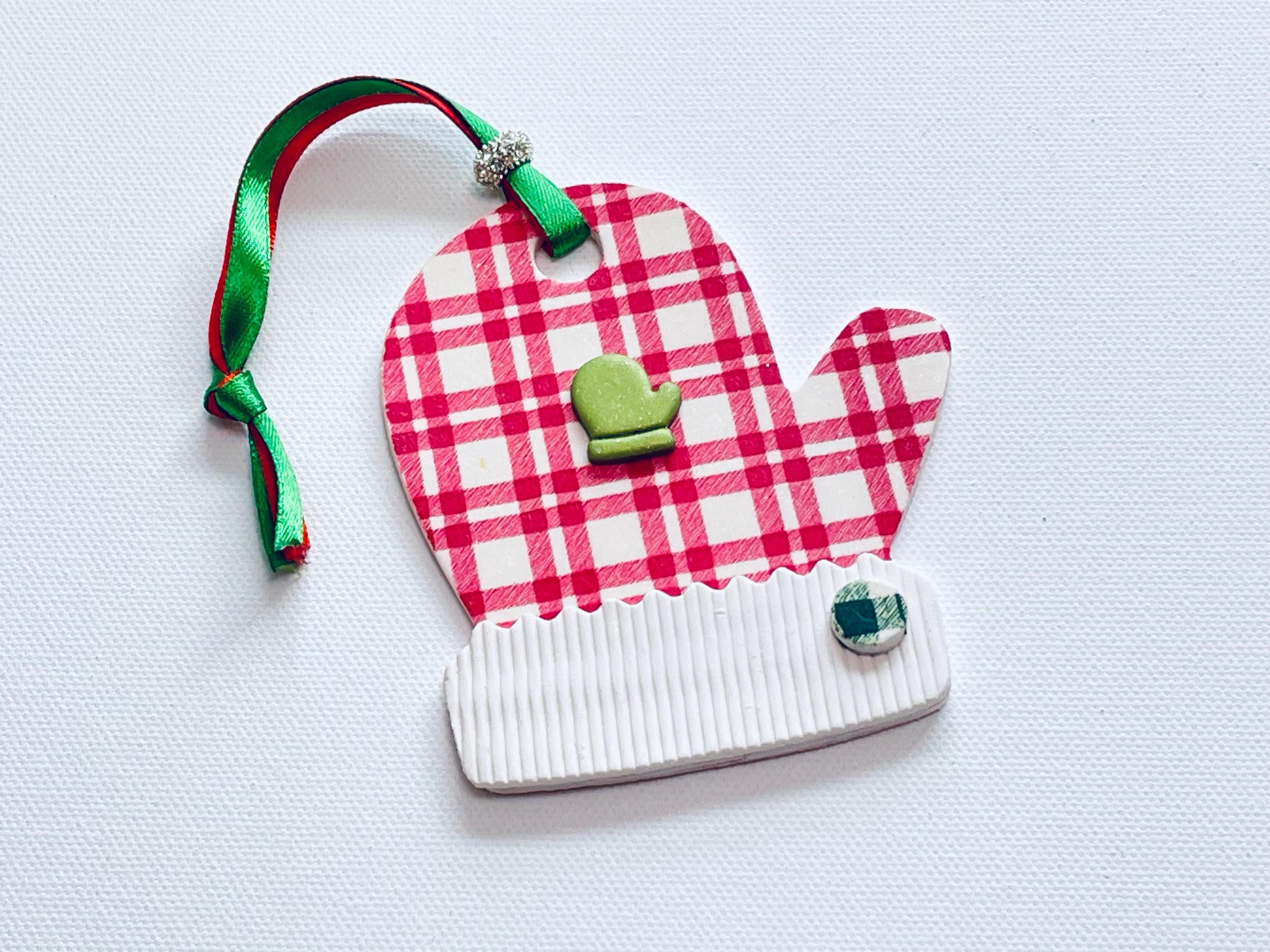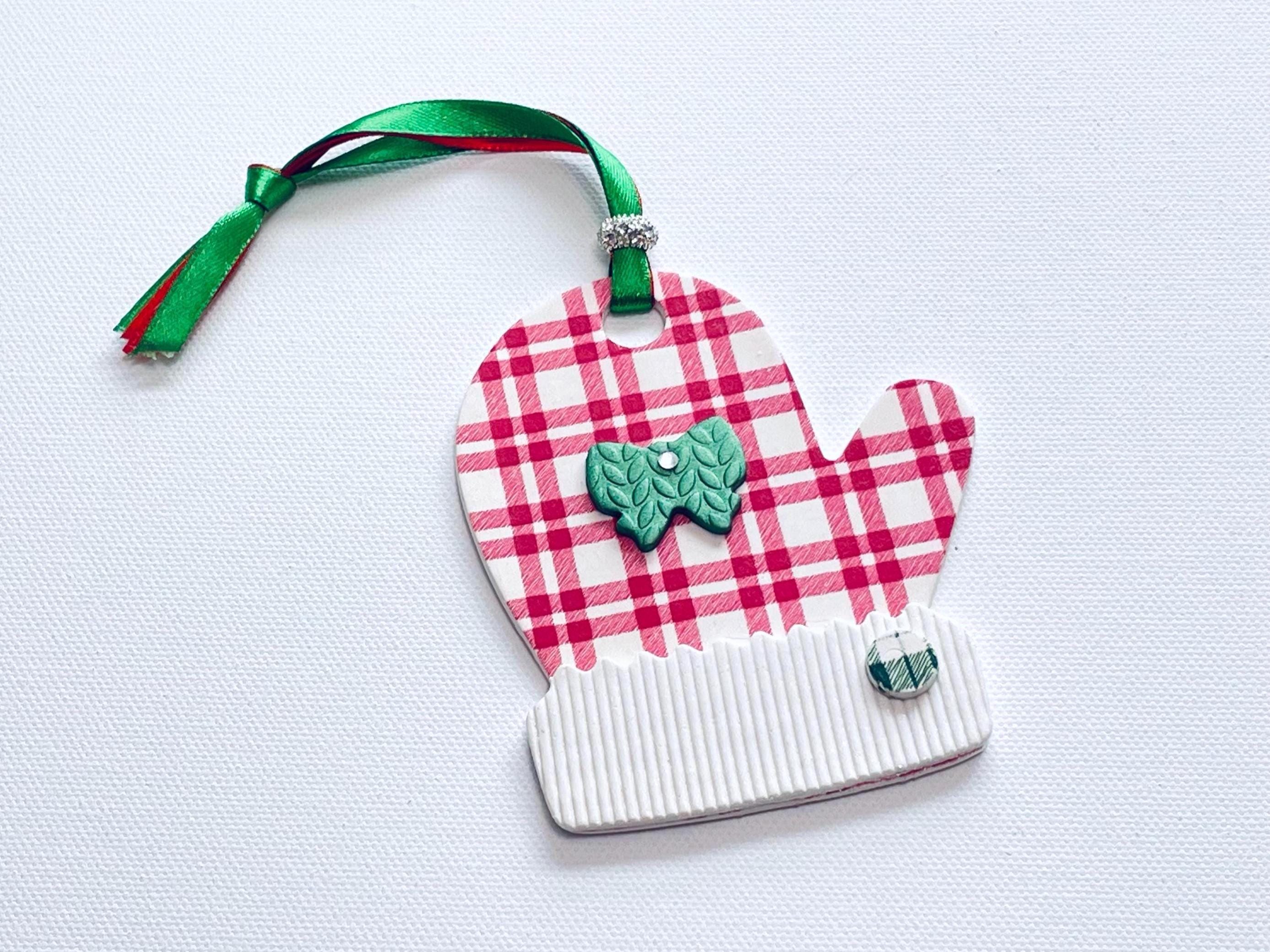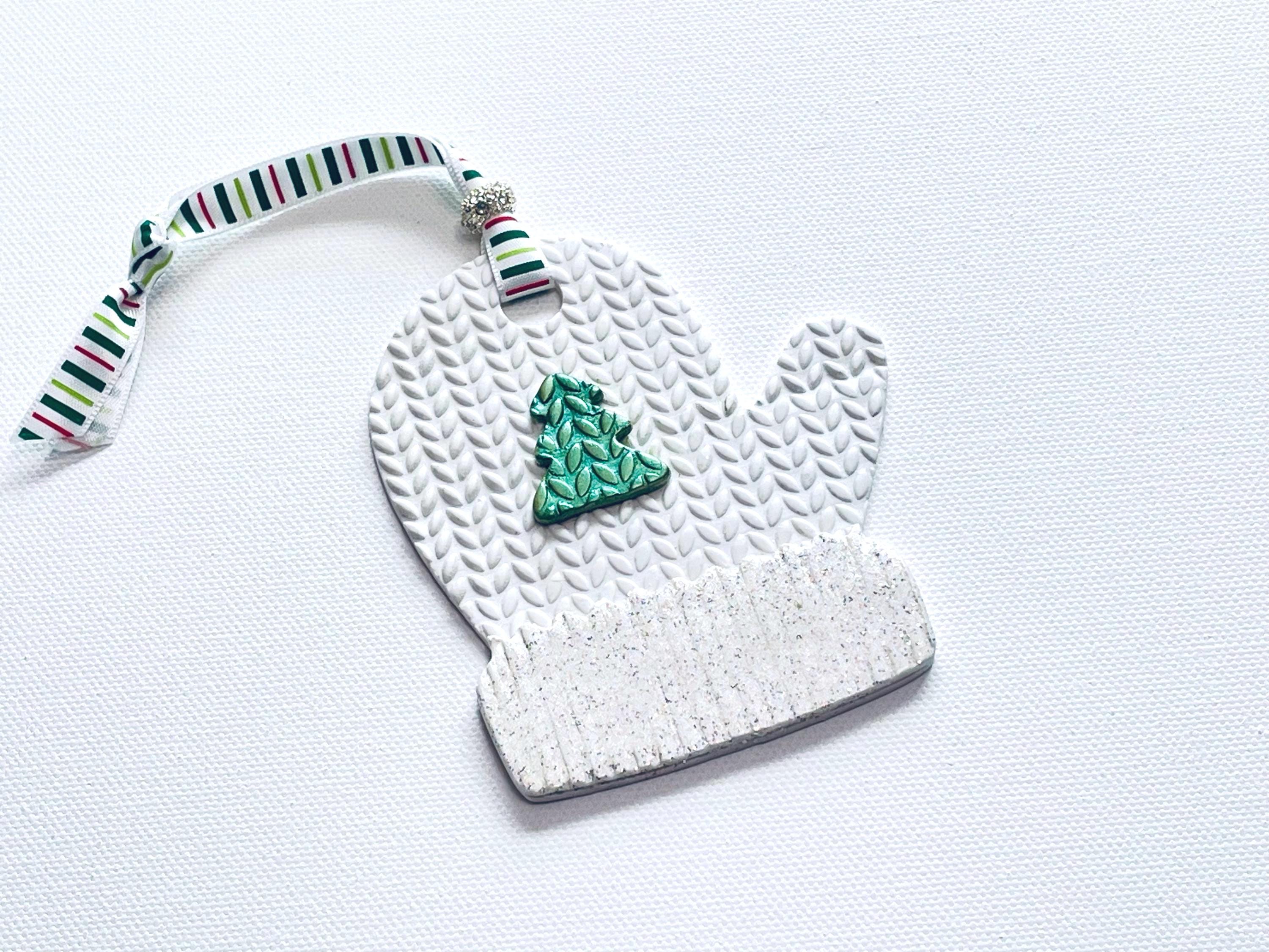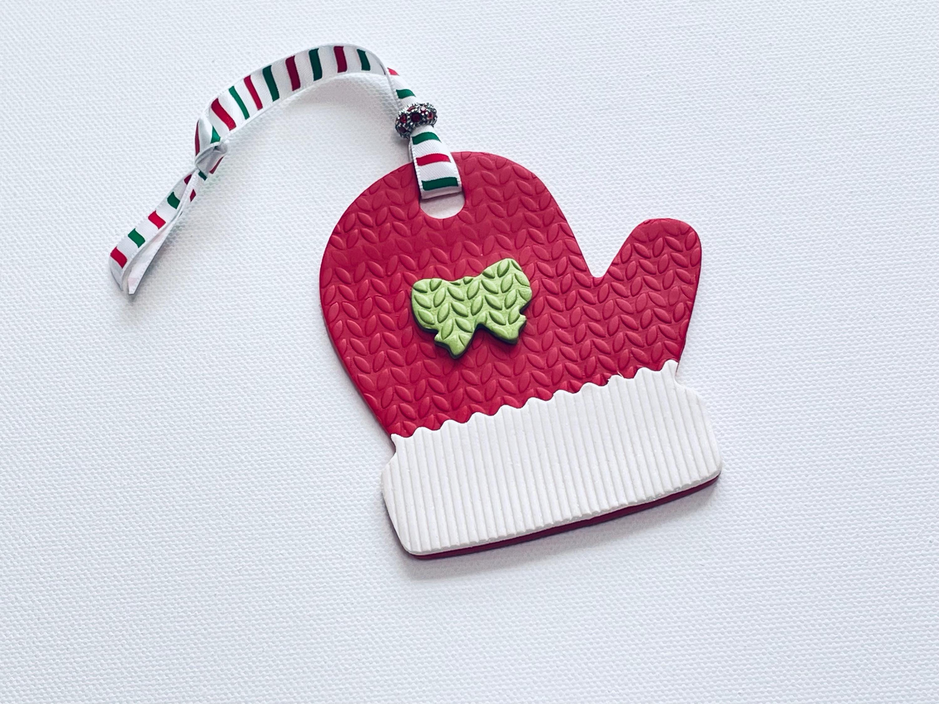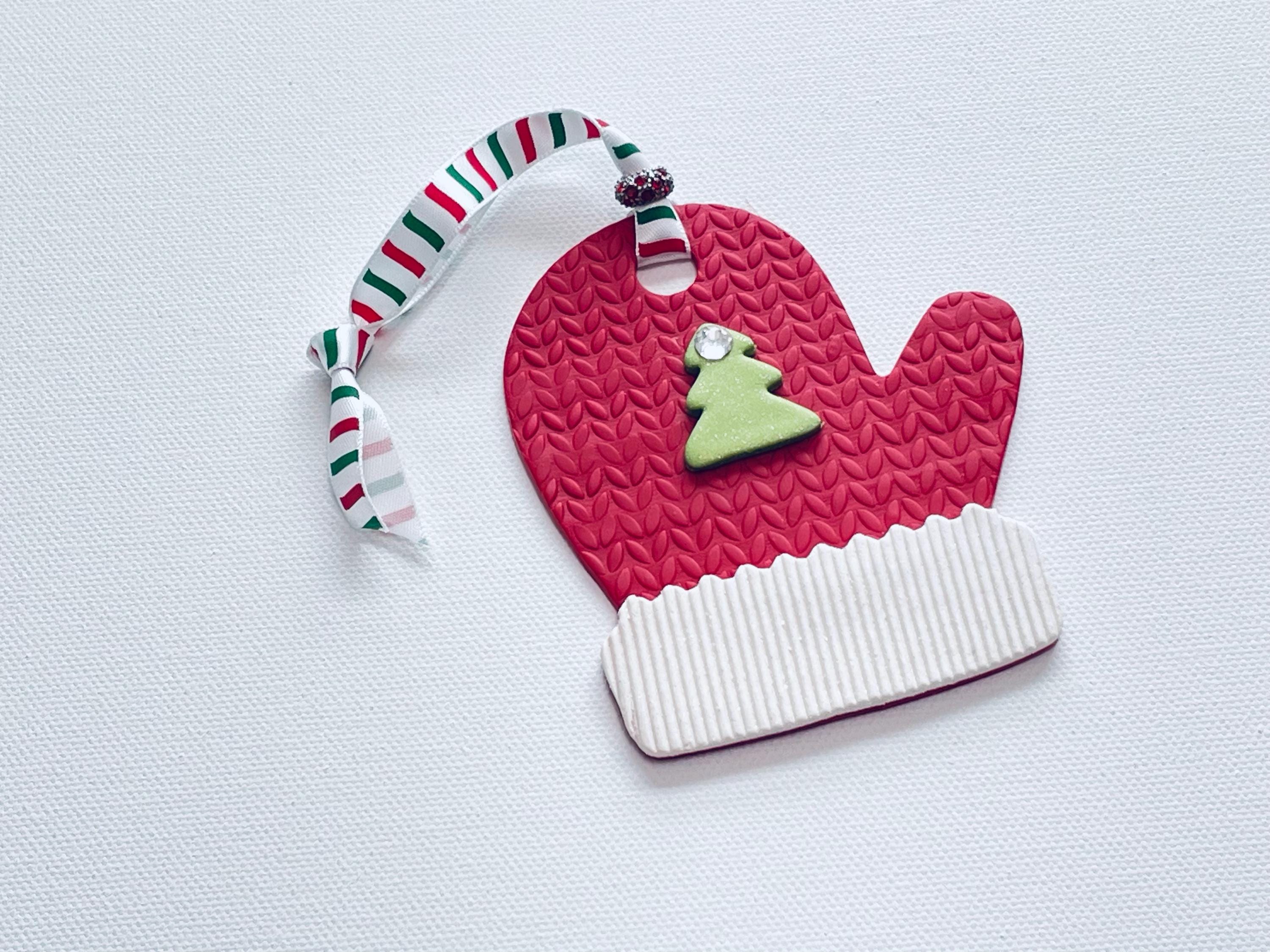 Polymer Clay Mitten Ornaments are meticulously handcrafted to decorate your Christmas tree for the holidays with various designs, textures and patterns with 3-D clay "appliques" as shown. Choice of Red & White Plaid with applique, White on White Knitted Texture with Green Tree applique, or Red with White Cuff Knit Textures with various shaped applique as shown. Decorate your tree for the holidays or beautiful to use as a unique gift tag on wrapped presents, too!