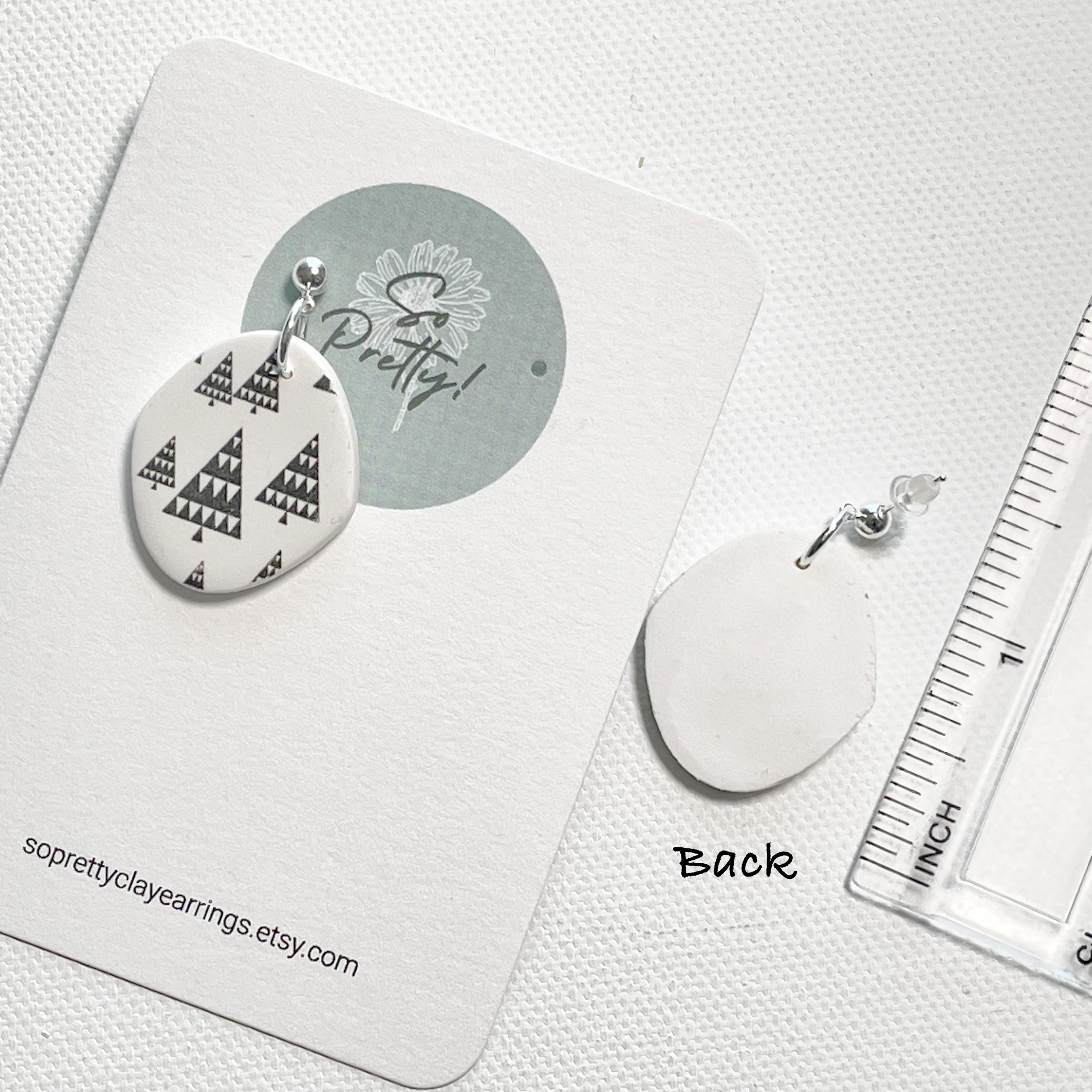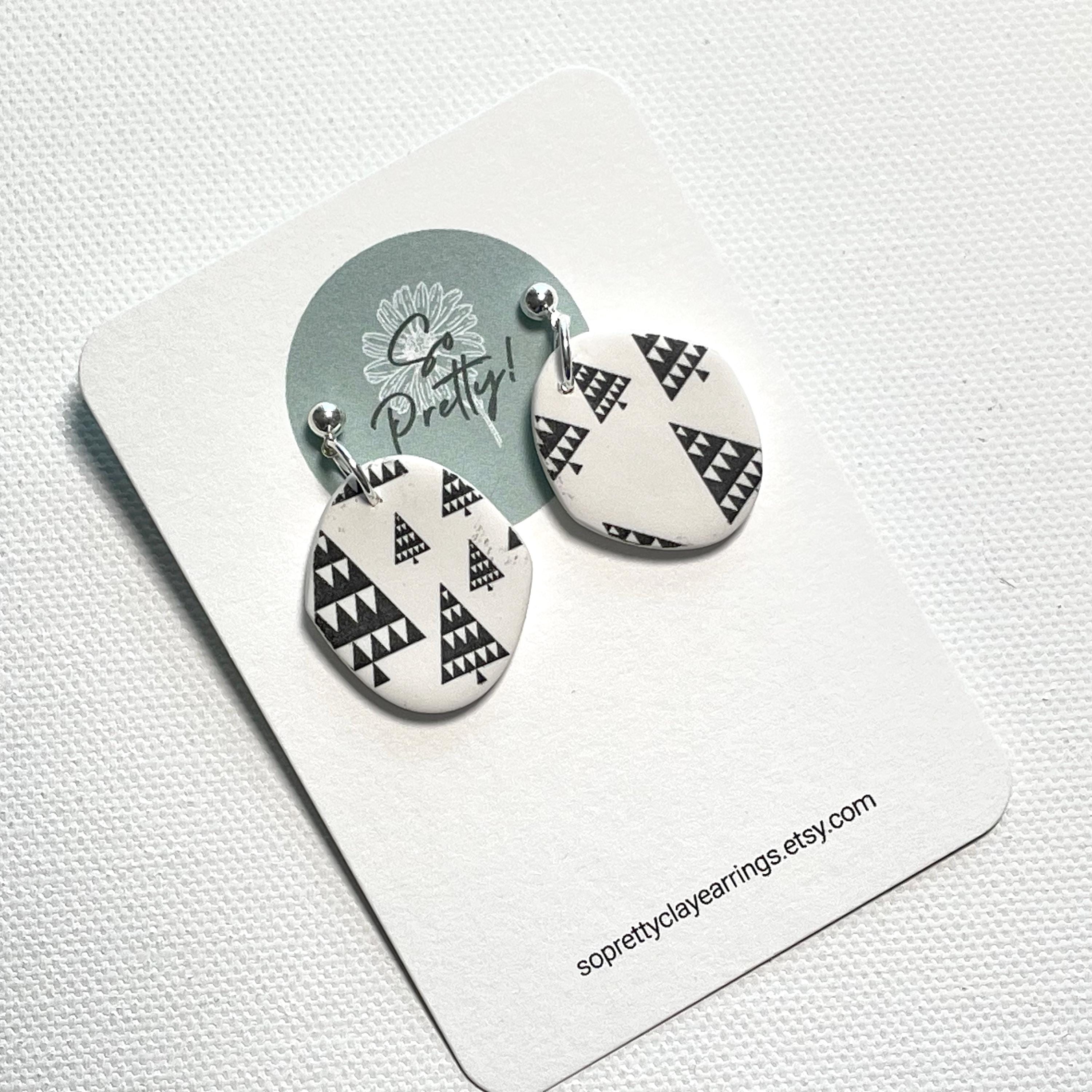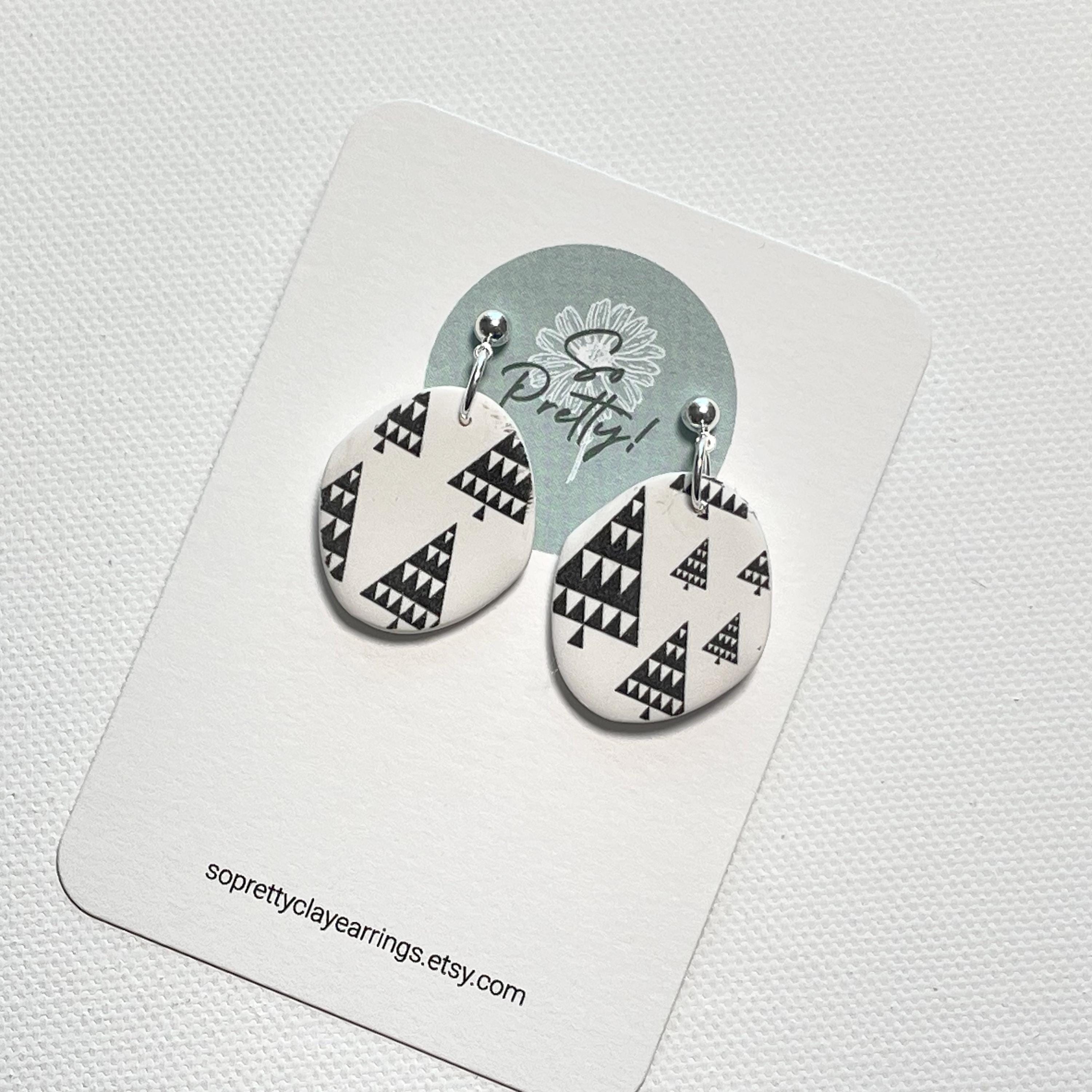 Polymer Clay Black & White Scandanavian Christmas Tree patterned Fancy Oval Dangle Earrings with small Ball Post Brass studs. Earrings for Christmas holidays and winter. Each pair of winter dangle earrings has its own unique pattern.