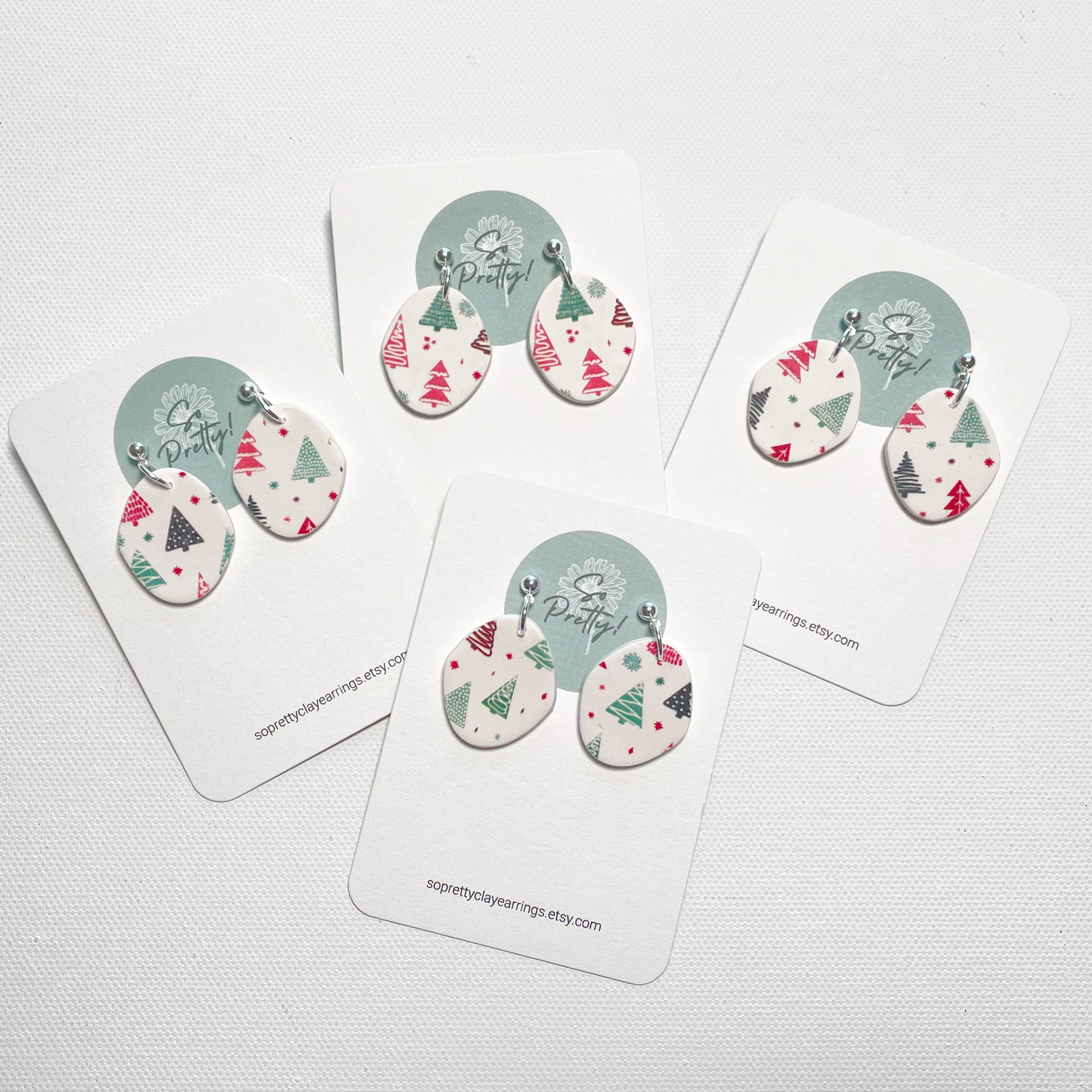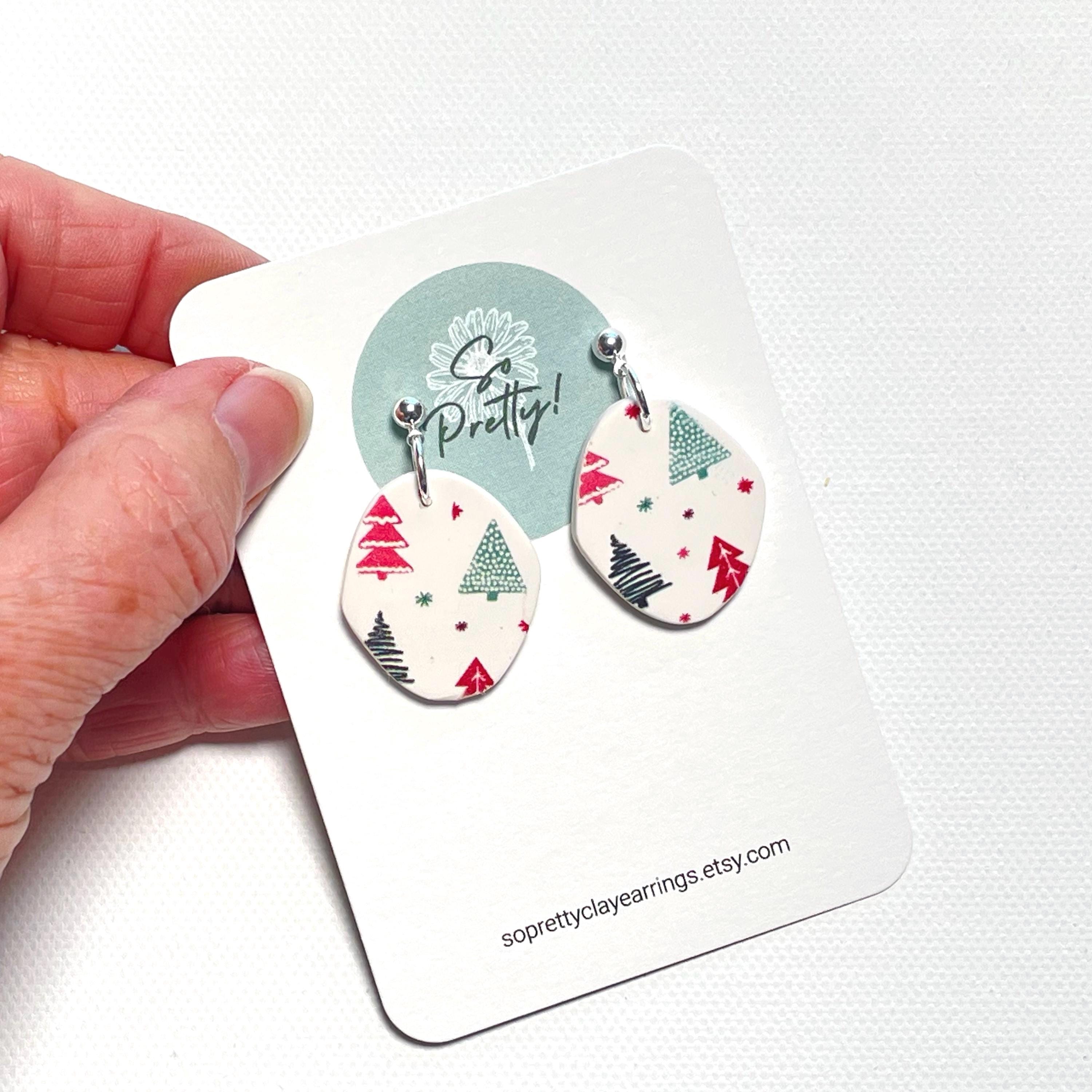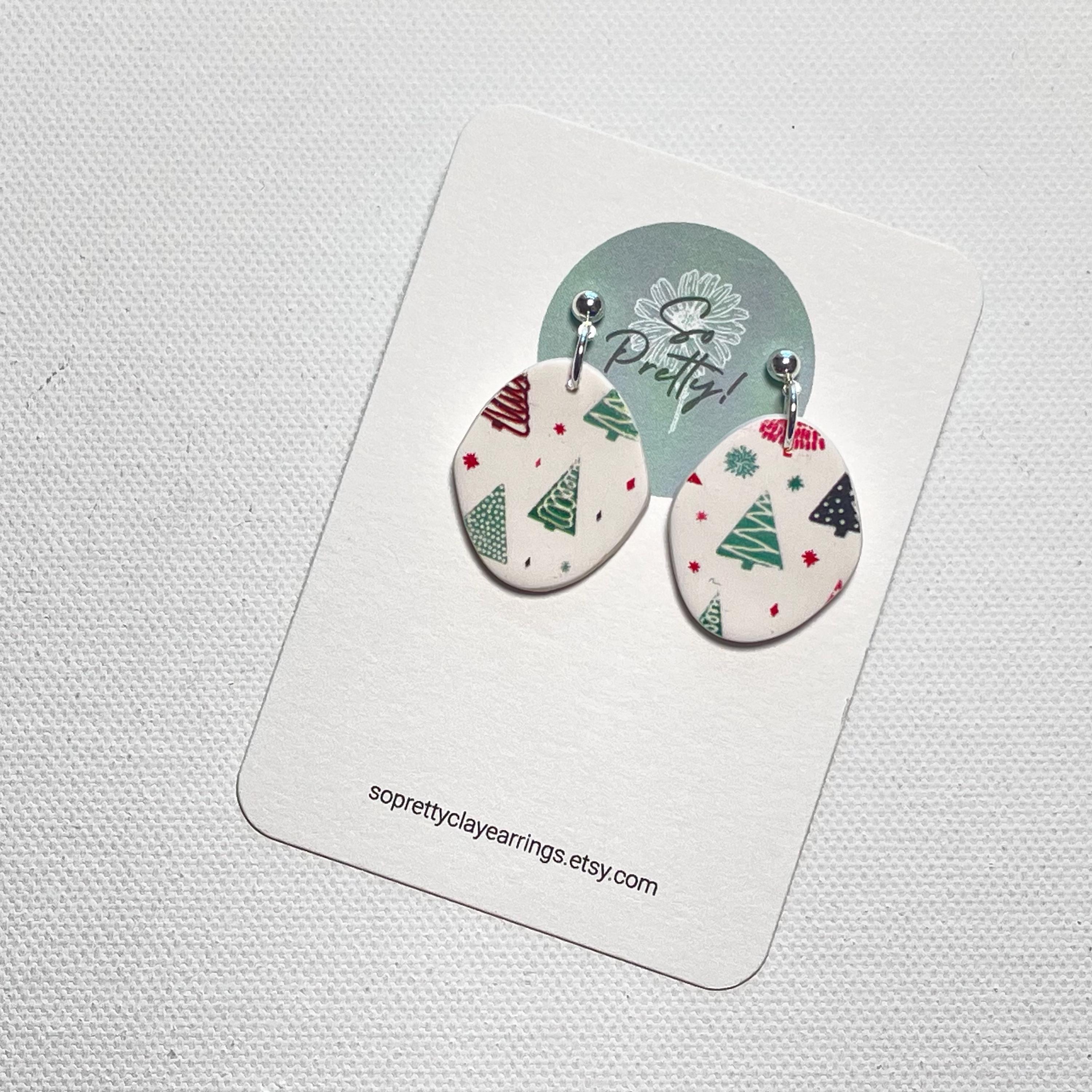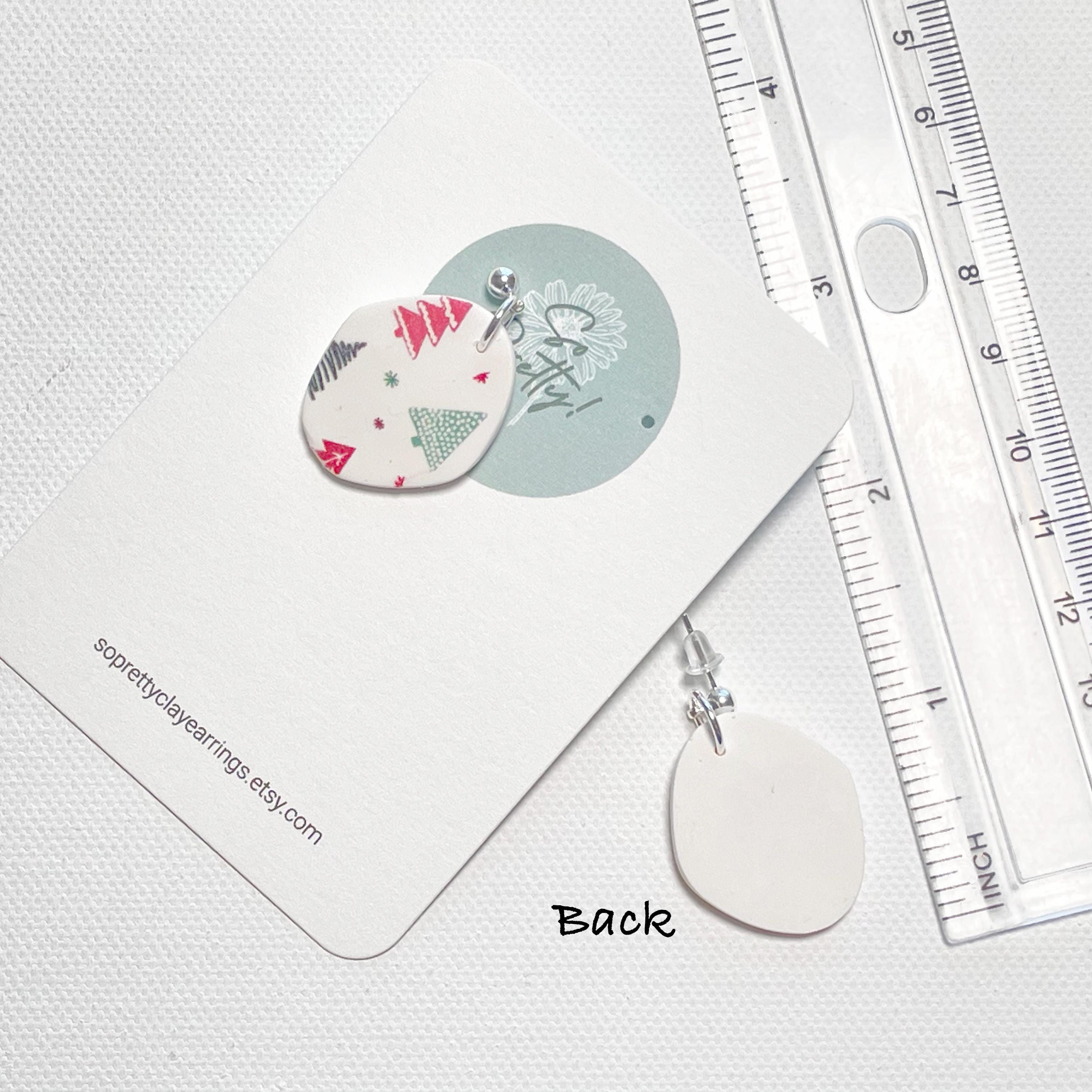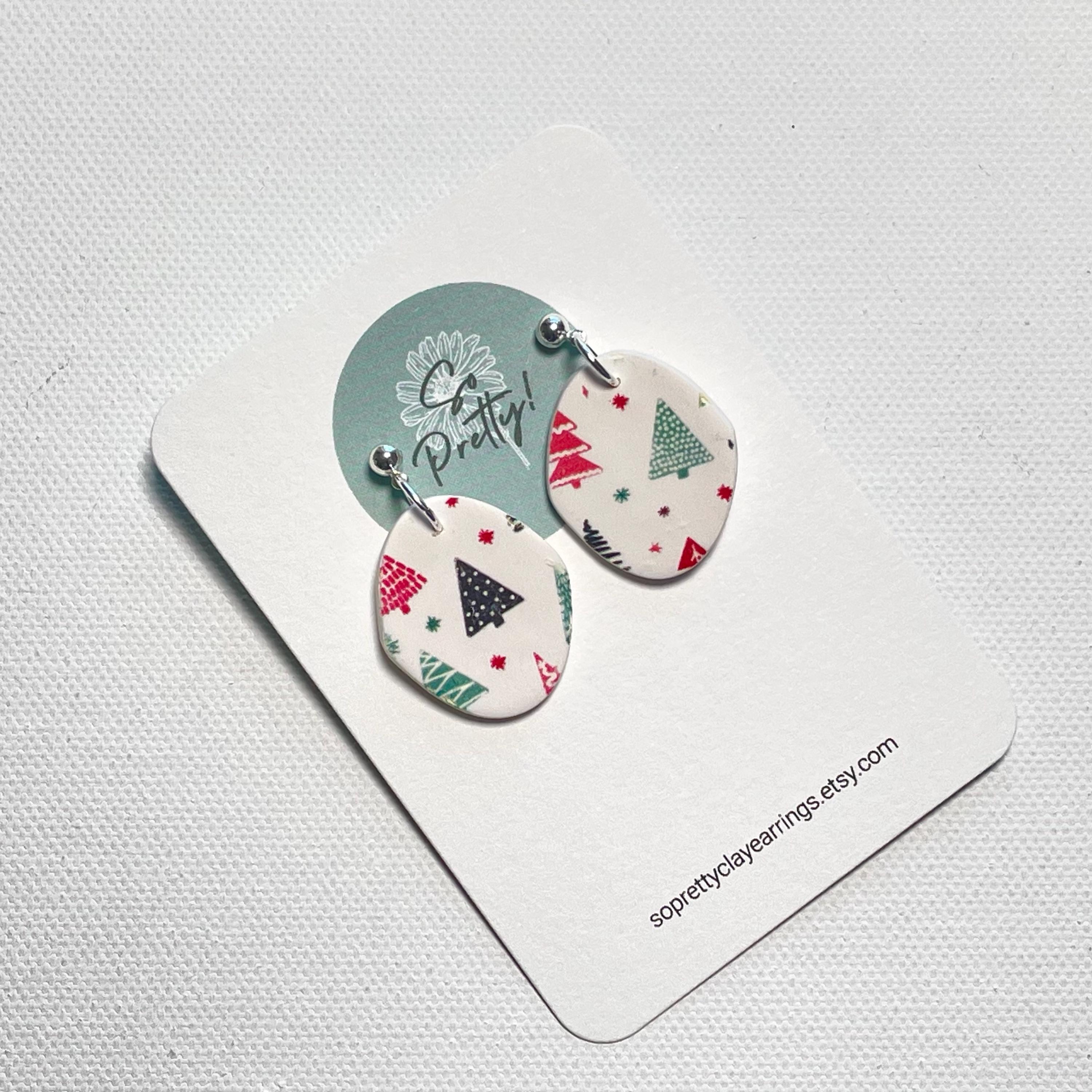 Polymer Clay Multicolor Christmas Tree patterned Fancy Oval Dangle Earrings with small Ball Post Brass studs. Earrings for Christmas holidays and winter. Each pair of winter dangle earrings has its own unique pattern.