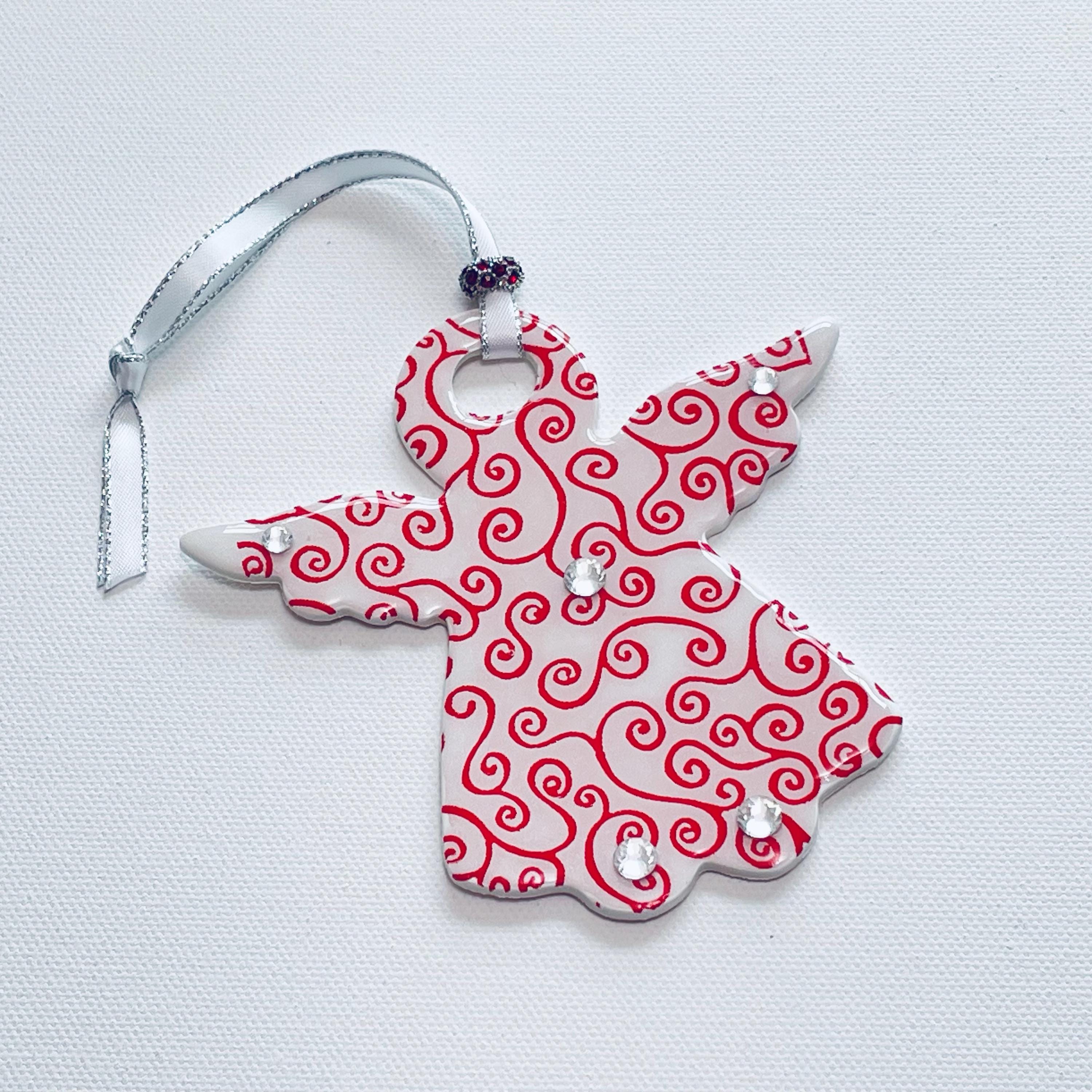 Polymer Clay Angel Ornaments are meticulously handcrafted to decorate your Christmas tree for the holidays with scrolly stencil designs painted on white clay embellished with faux rhinestones. Choice of Red & White, or Silver & White scrolly designs on angel shaped ornaments. Decorate your tree for the holidays or beautiful to use as a unique gift tag on wrapped presents, too!