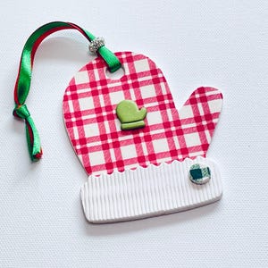 Polymer Clay Christmas Tree-Shaped Ornaments are meticulously handcrafted to decorate your Christmas tree for the holidays with stencil designs painted applied on clay background layer as shown. Choose from various styles and silkscreen patterns: Christmas Trees, Christmas Stockings, Red Circles embellished with Faux Rhinestones, or Silver Metallic with Green and Red 3-D "ornaments". Decorate your tree for the holidays or beautiful to use as a unique gift tag on wrapped presents, too!