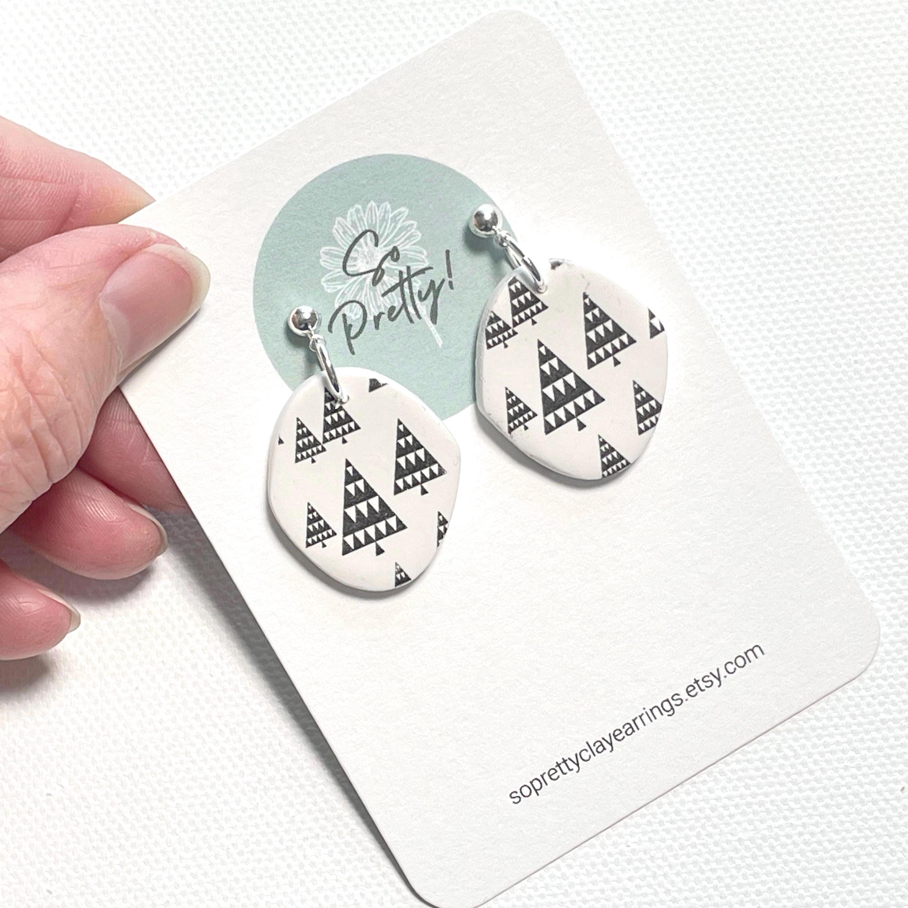 Black & White Christmas Tree Earrings: Polymer Clay Dangle, Silver Ball Post