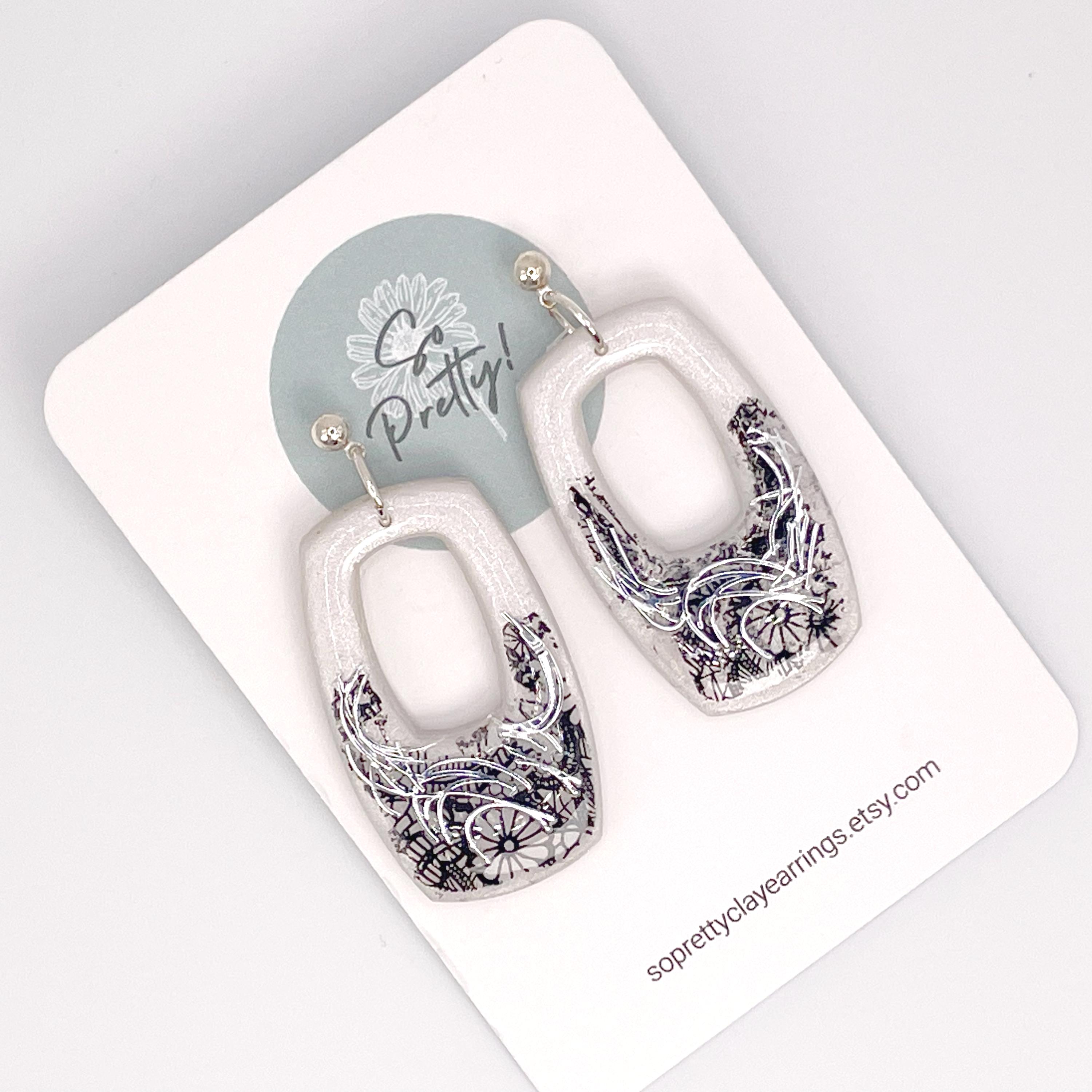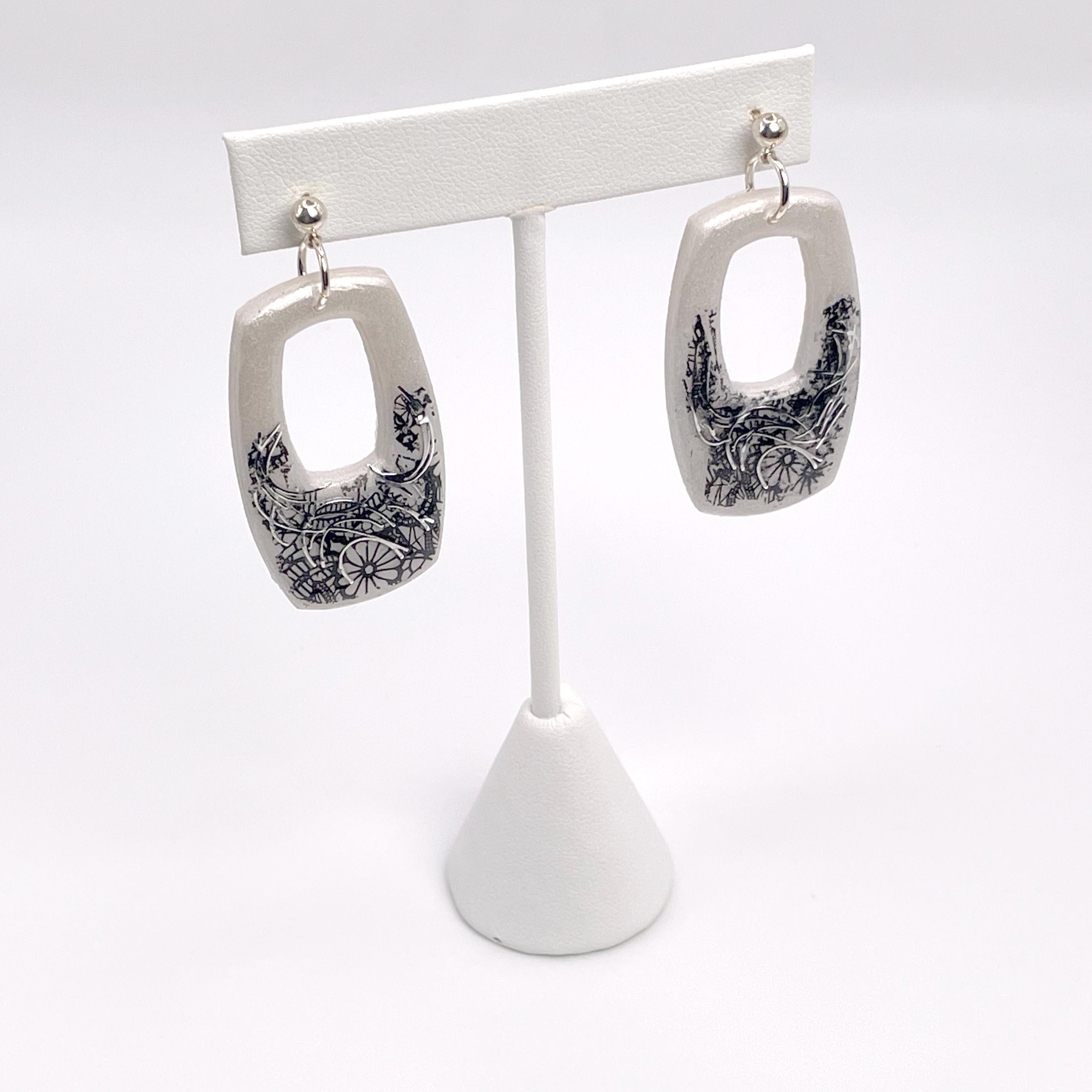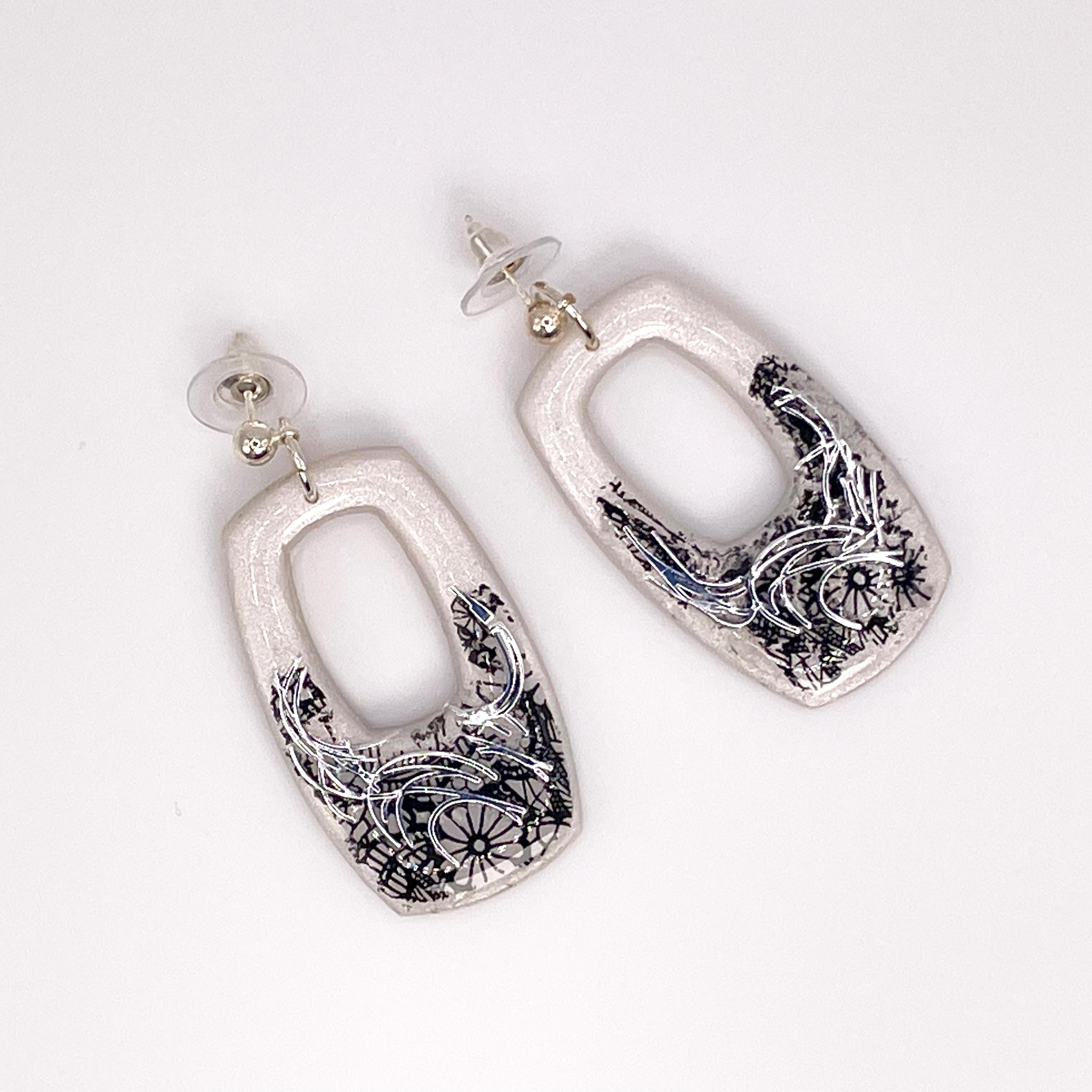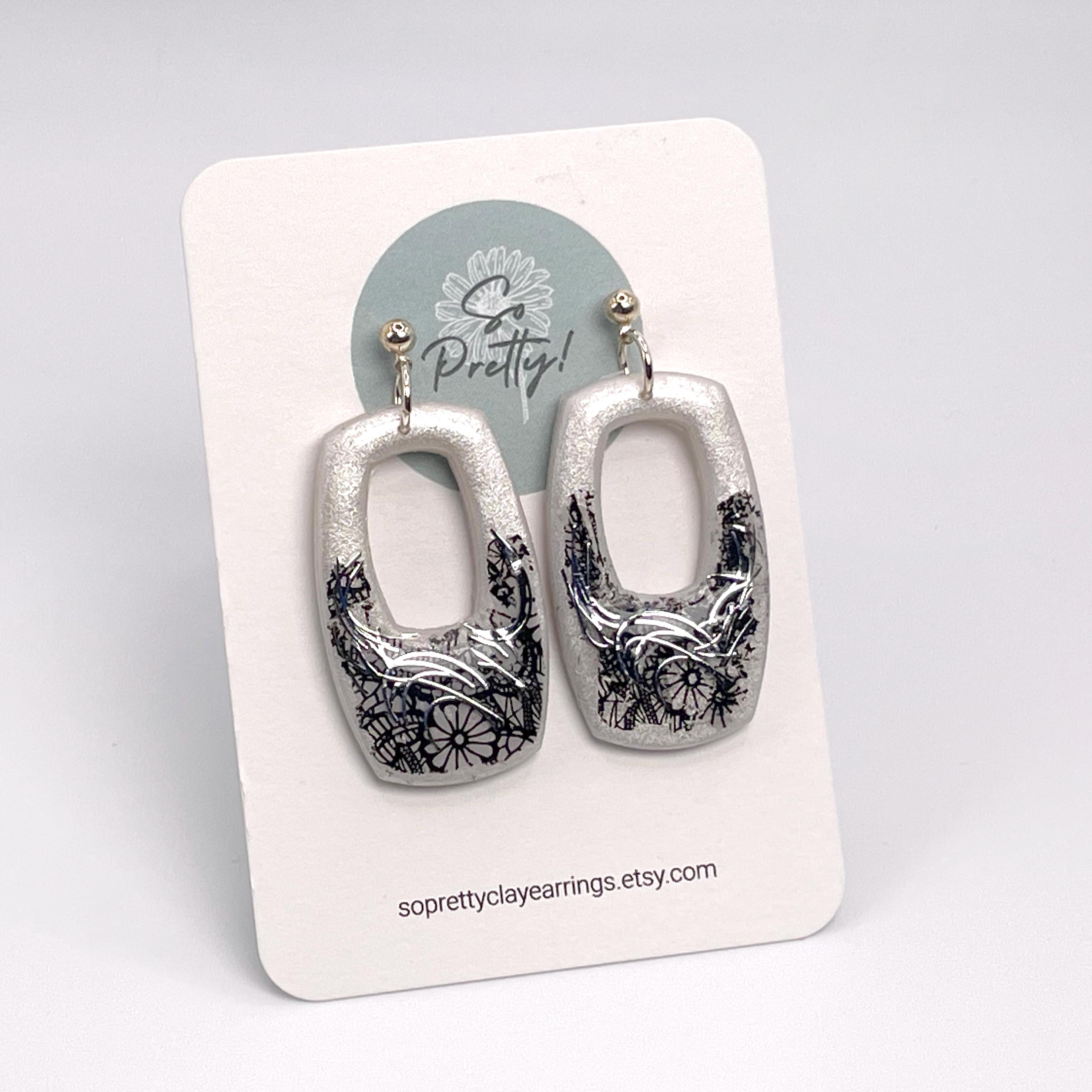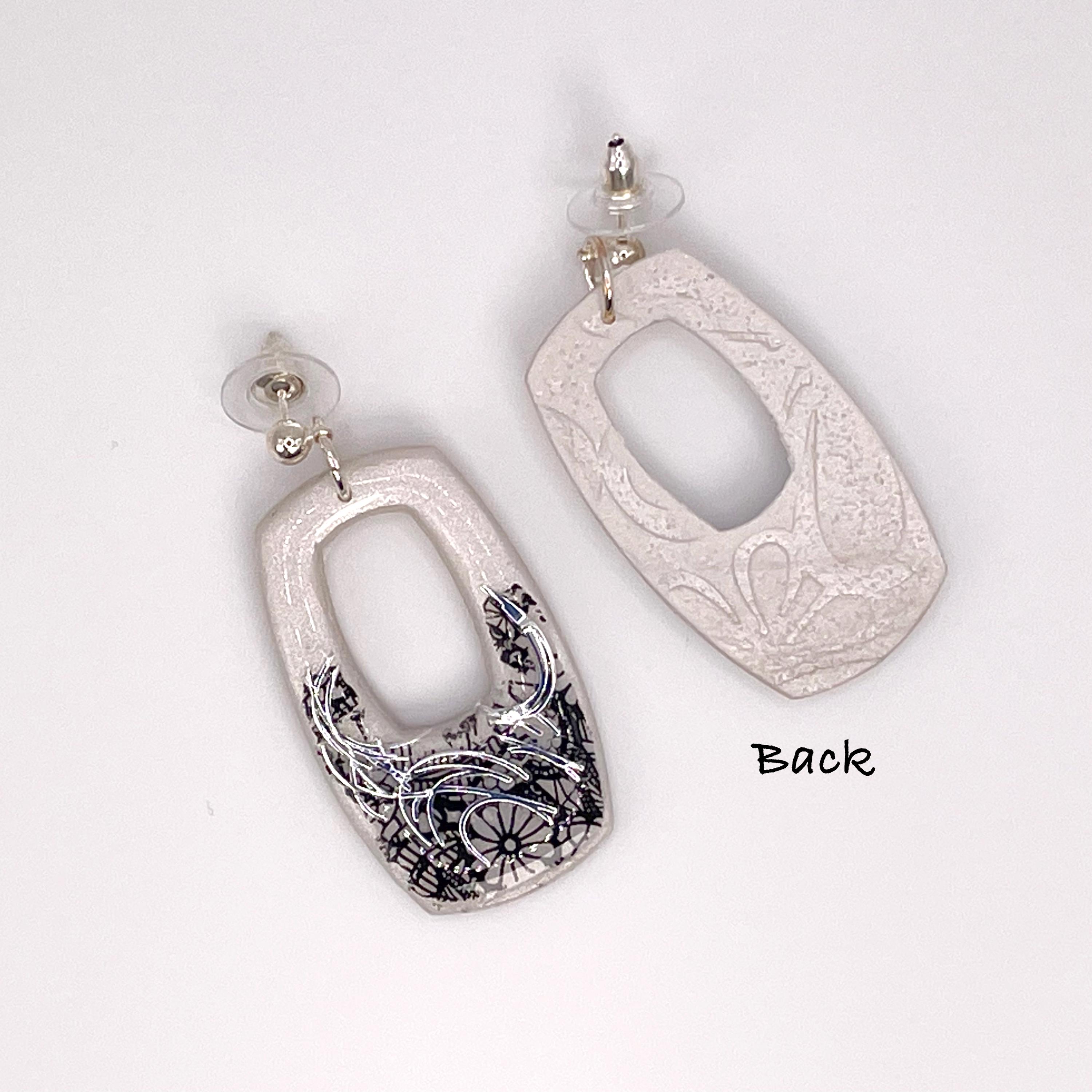 Boho Black & White Polymer Clay Open Rounded Rectangle Dangle Earrings. Colors are halftone in Pearl White on top and lower black "edgy" floral lace pattern accented with Silver Swirls. Back of earrings have a light textured pattern. Fronts of earrings are finished with UV resin for a glasslike glossy sheen that enriches the depth of colors.