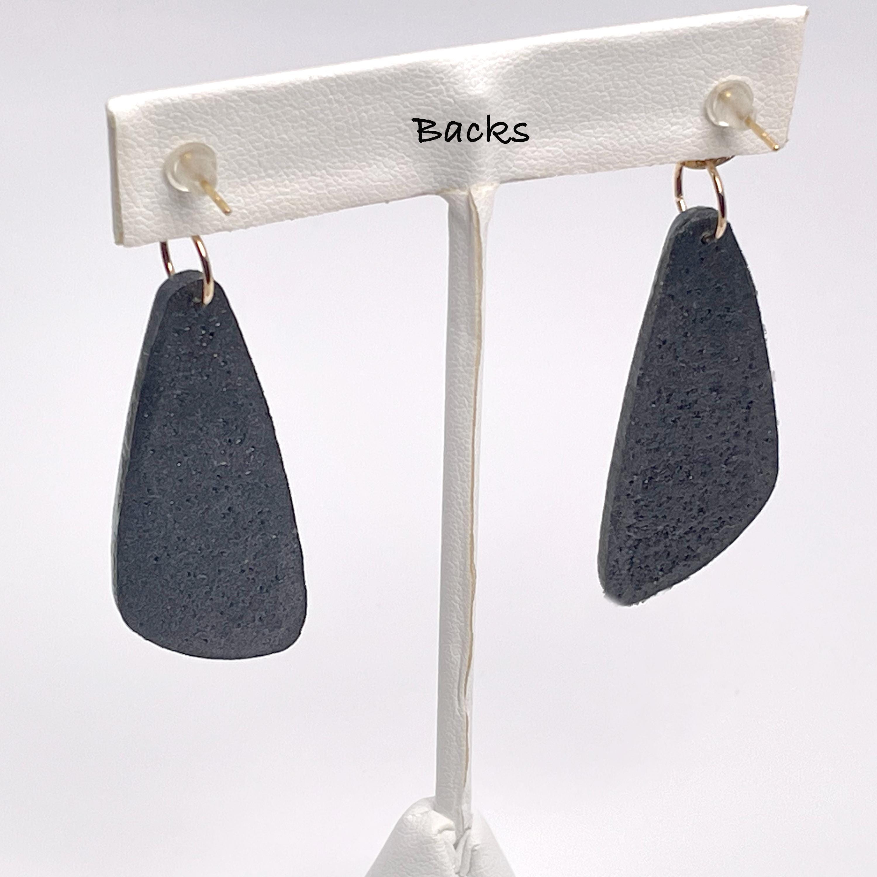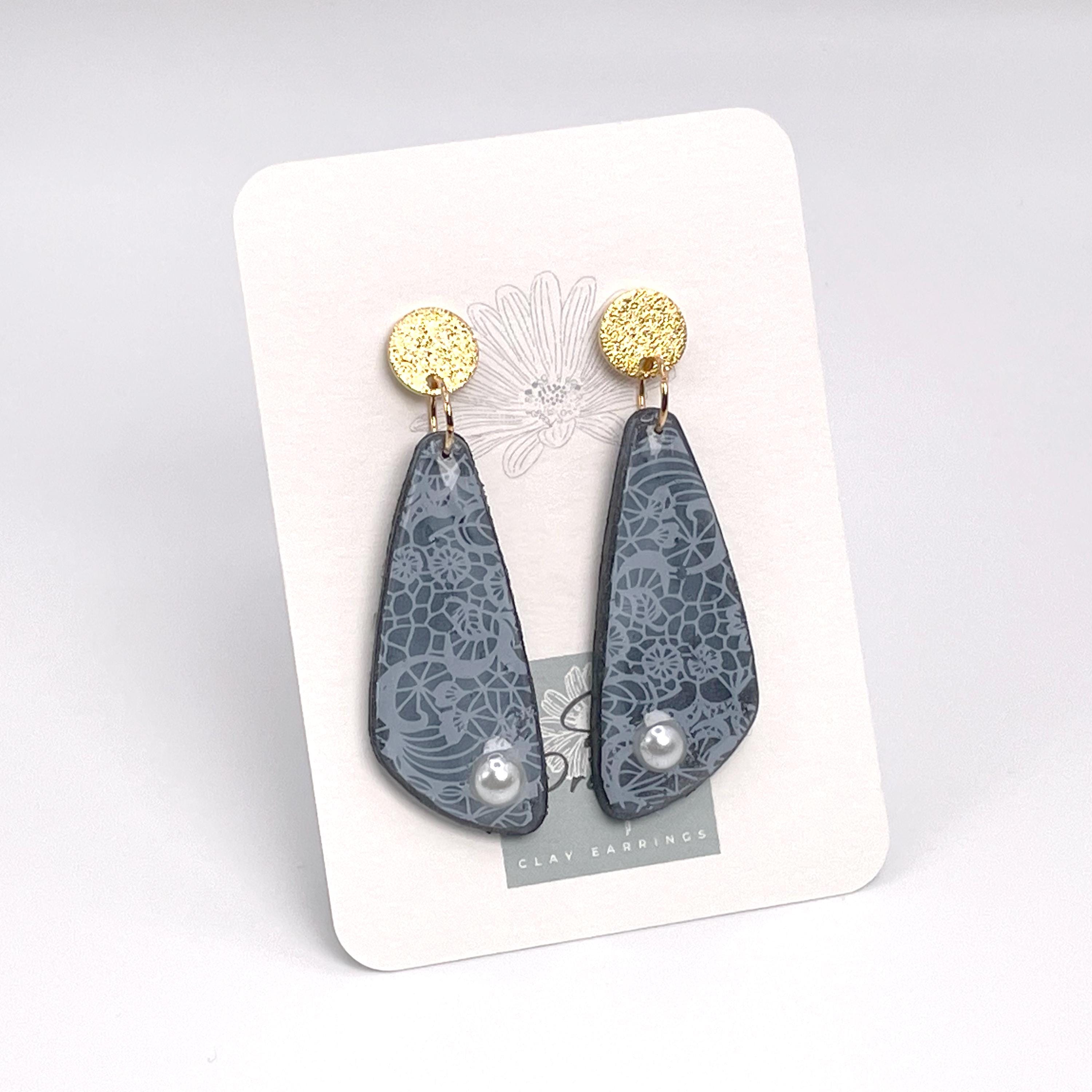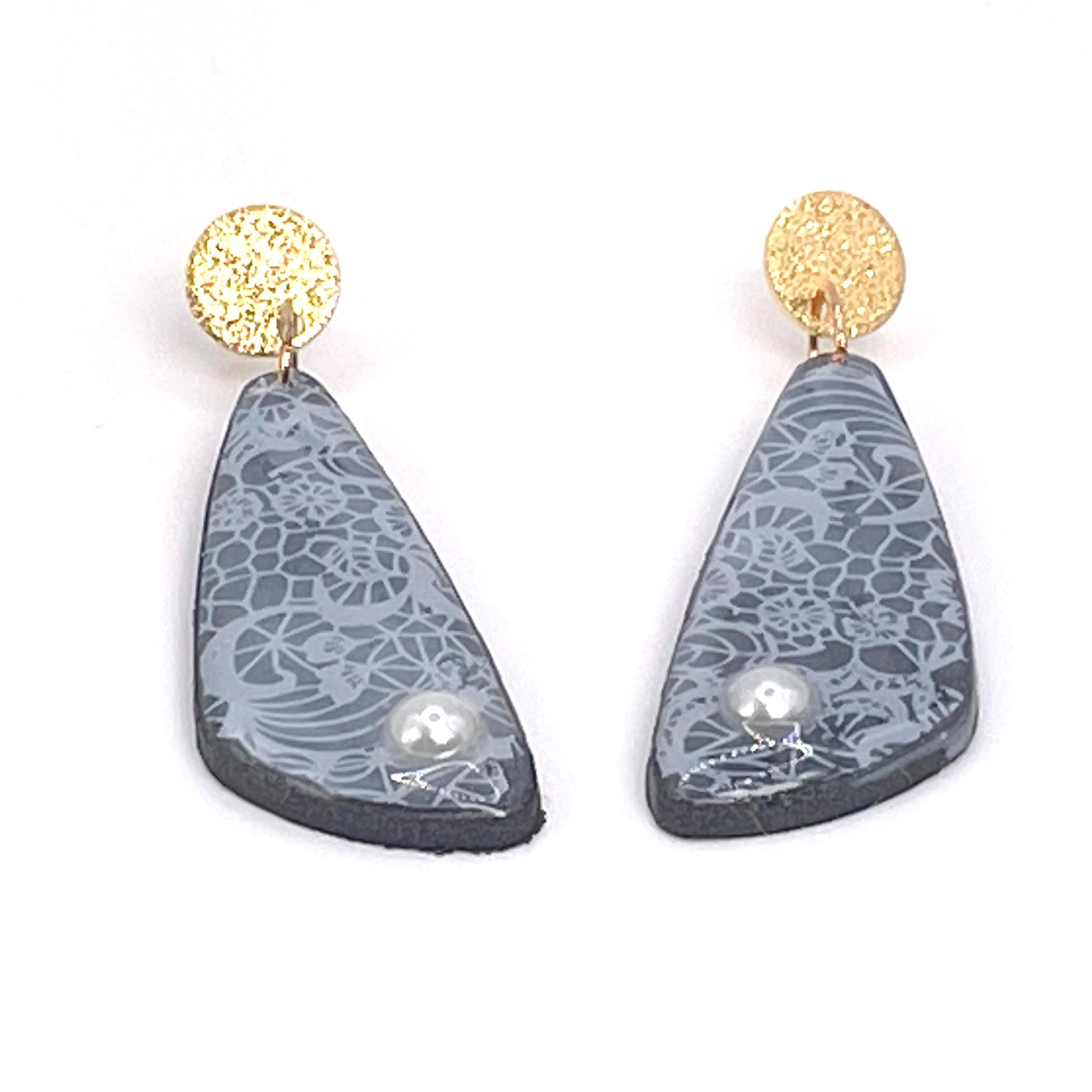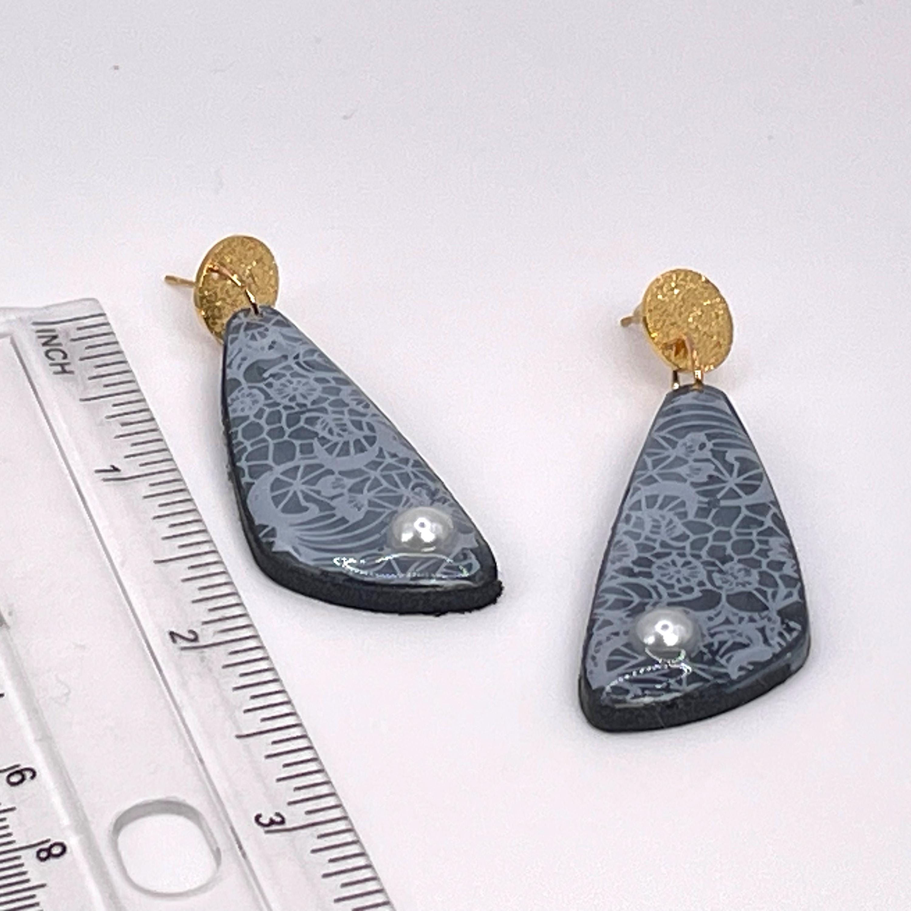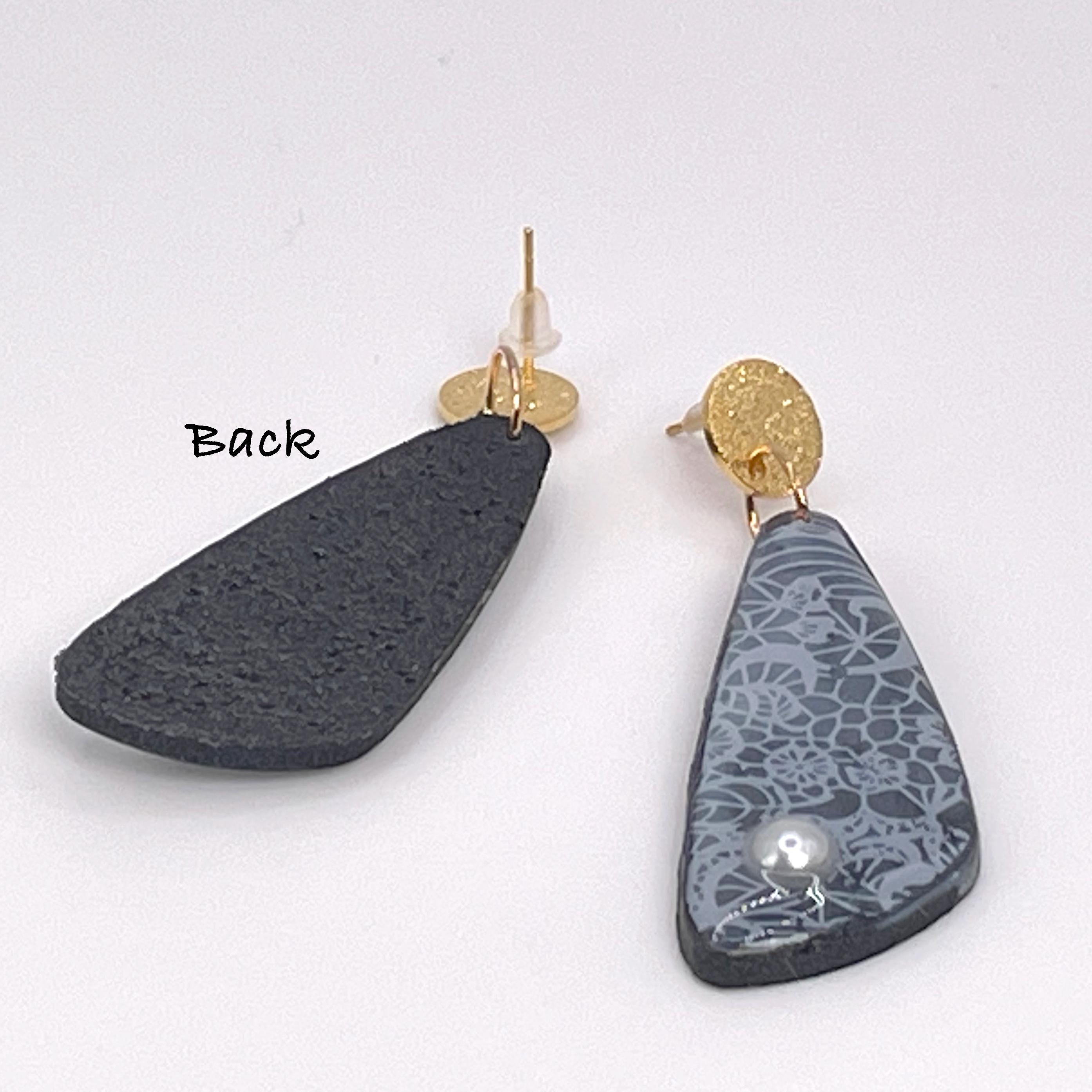 Light Gray Lace patterned long dangle earrings each are accented with a Faux Pearl Polymer Clay long Teardrop Dangle Earrings. Bora Bora Triangle Dangles have 10mm Round Coin Earring Studs coated in hypoallergenic 18K Gold Stardust. UV Resin finish on the fronts with sand textured dark gray backs.